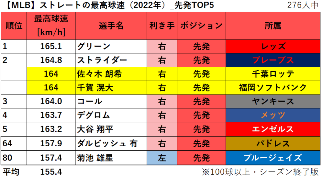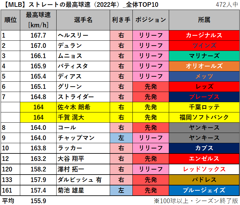 ②最高球速は平均155.9km/hで、約164km/hだとトップ10